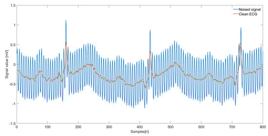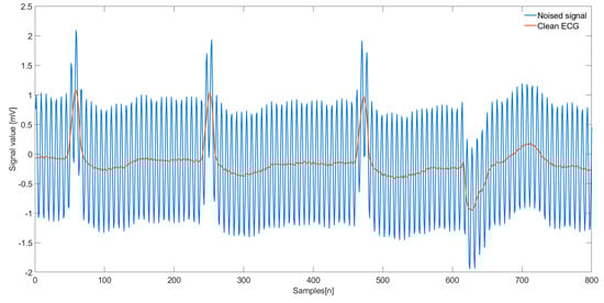where N is the number of calls of Equation (9) in the manner given in Equations (14). The MSE between the filter response signal and the interference-free ECG signal is shown in Figure 3.