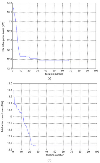 With the network losses objective, all control settings are regulated to minimize the total active power losses. The network losses function is a mathematical modeling to find the value of network losses in the electric power system. The network losses function is also a nonlinear equation. The network losses function in the OPF problem is given in Equation (3):