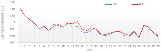 Voltage profile comparison between PSO-OPF and IPSO-OPF.