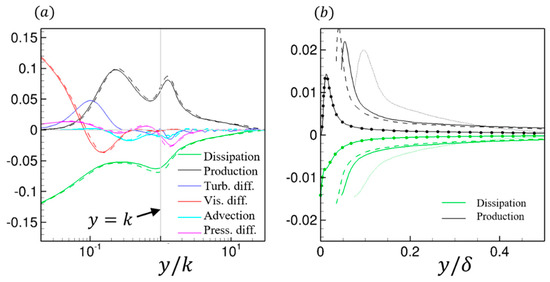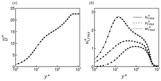 Figure 19b. There is a good agreement near the wall between the current equilibrium smooth-wall results and the data (open symbols) from the DNS of a channel at