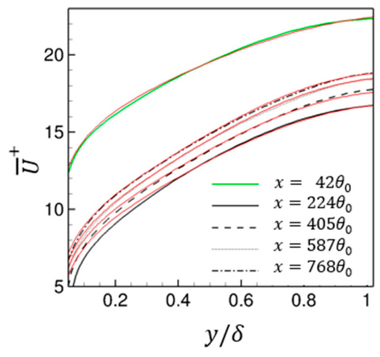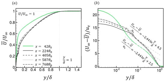 The wall-normal variation of mean velocity using outer and defect-law scaling is presented in