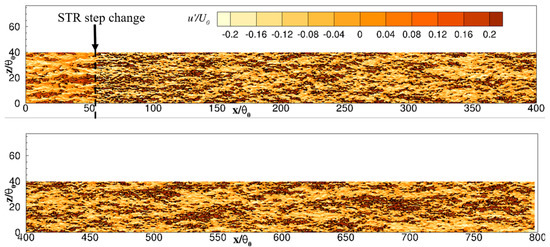 also gradually decreases as the TBL above the rough surface grows with increasing fetch length. While the crests of roughness elements immediately after the STR step change generate nearly horizontal hairpin vortices with a length scale