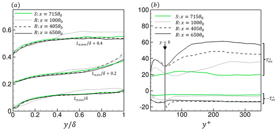 0.1, with the last two of the three streamwise stations showing a decent collapse with the smooth-wall profiles. These results suggest that a near equilibrium for the integral length scale is in place across the entire TBL by