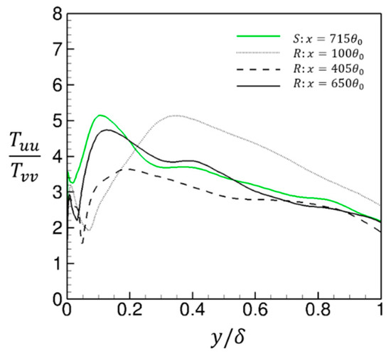 station, the ratio is suppressed below the equilibrium level as the roughness is effective in reducing the anisotropy of the turbulence integral timescale for much of the outer layer. This effect is constricted to only the lower part of the TBL by the latter streamwise location. Consequently, a nearly excellent match with the equilibrium smooth-wall ratio for