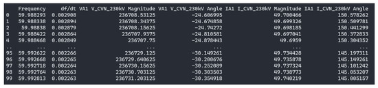 Data of frequency, rate of change of frequency (df/dt), magnitude and angle of voltage and current of phase A, normalized.