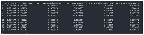 Data of frequency, rate of change of frequency (df/dt), magnitude and angle of voltage and current of phase A).