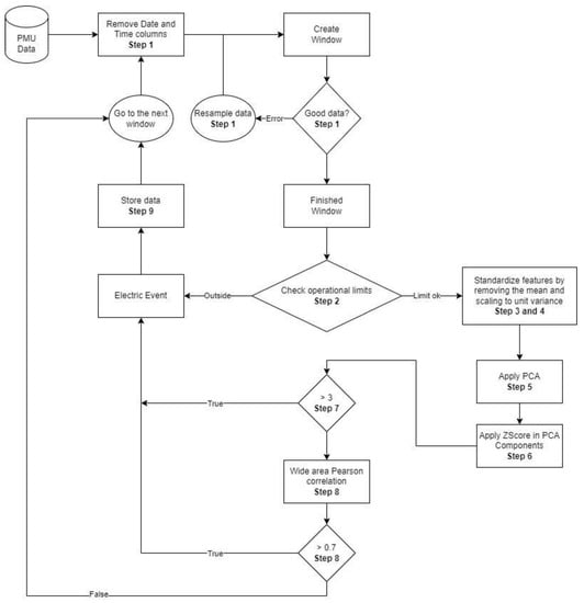 Thus, in possession of these two powerful tools, the proposed method for event detection in ESP is described step by step, and are repeated (from step 1 to step 8) for each tumbling window of 1800 samples (for example) and for each datapoint of the PMU being considered.
