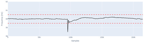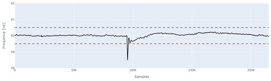 Step 2: identification of measurements outside the operational limits normalized by the operator system (ONS). In this way, when frequency quantities or voltage magnitudes are outside their normative limits, the recording of the event begins regardless of the application of the PCA technique.