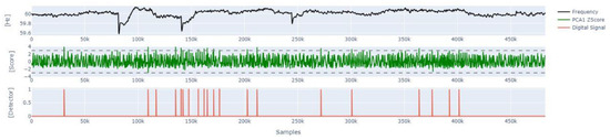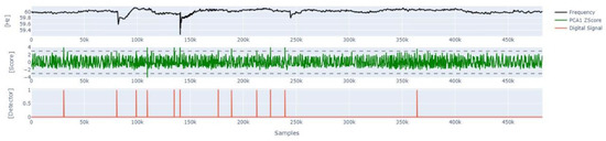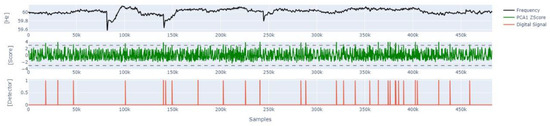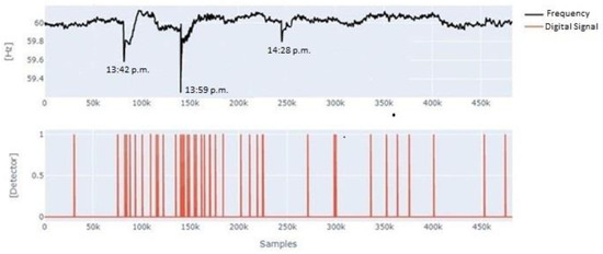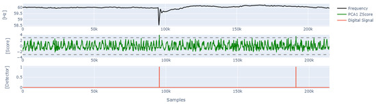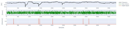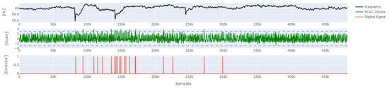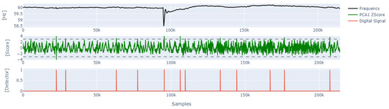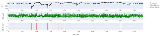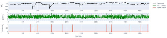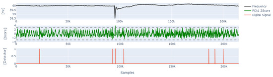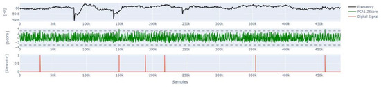 Figure 13, Figure 14, Figure 15, Figure 16, Figure 17, Figure 18, Figure 19, Figure 20 and Figure 21 show the signal of frequency of the PMUs described, the PCA values and the points detections of each PMU cited, along more than 2 h, starting at 1:20 p.m.