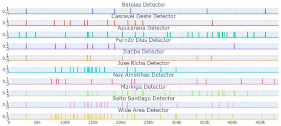 The second anomaly occurred at 1:59 p.m. According to Figure 22, it was detected by seven PMUs (Cascavel, Apucarana, Fernão Dias, Itatiba, José Richa, Maringá and Salto Santiago). In Figure 23, it can be observed that the final detection was found at 13:59 p.m.