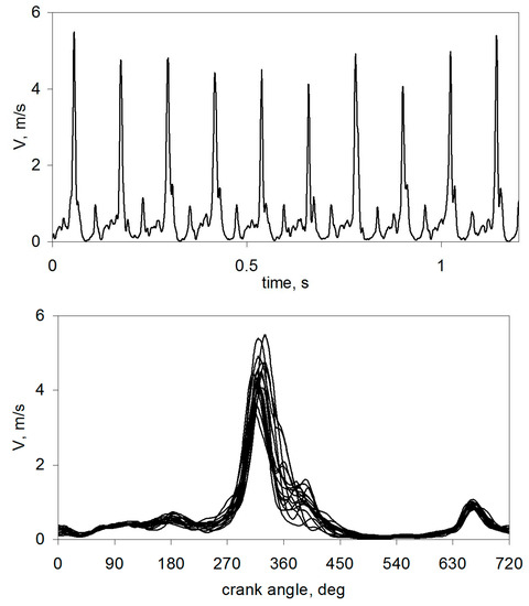 The difference in speed occurs not only in its maximum value but also in the angle of the crankshaft position. As seen from the data in Figure 1, the speed peak value occurs before the piston reaches TDC, i.e., within the CA range, which is essential for developing the initial combustion phase. Many factors in the cylinder of a reciprocating engine contribute to the uniqueness of its successive cycles. These factors affect the stability of the combustion process. Combustion instability can be divided into several categories: