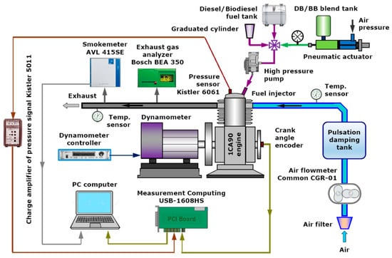 Experimental research was carried out on a stationary, industrial, compression-ignition engine designed to drive various types of machines and devices, mainly in the agricultural industry. It is a single cylinder, naturally aspirated, air-cooled, four-stroke engine with a nominal power of 7 kW, working at maximum load (IMEP = 0.68 MPa) and constant speed (1500 rpm). The tests were carried out for the nominal engine load. A dynamometer with a DC generator was used to measure and stabilize the power, load and rotational speed of the engine. The indicator system included: a piezoquartz pressure sensor (Kistler 6061), placed in the combustion chamber, a charge amplifier (Kistler 5011), a crank angle marker (encoder), installed on the engine crankshaft and a digital data acquisition system with an A/D card (Measurement Computing USB-1608HS), a PC and specialized software (National Instruments LabVIEW). The encoder enabled detection of the top dead center (TDC) signal and the angle of rotation of the crankshaft with a resolution of 1 deg CA and its synchronization with the pressure signal. Measurement of air consumption was carried out using a rotor flow meter (Common CGR-01) through a tank damping pulsations in the intake manifold. Fuel consumption during engine operation was determined by measuring the time of emptying an additional glass fuel tank of a known volume. The system made it possible to correct the measured consumption with a dose of fuel returned from the injection pump and the injector. For each operating point, the pressure was recorded in 200 consecutive cycles, after the engine had been thermally stabilized. As part of the research, engine exhaust emissions were also measured. Concentrations of NO, THC, CO, and CO2 were recorded using a five-gas exhaust gas analyzer (Bosch BEA 350), and the concentration of soot using an opacimeter (AVL Smokemeter 415SE). The method of measuring HC, CO, and CO2 emissions was the technology of nondispersive infrared (NDIR) spectrometry, while the measurement of NO emissions was based on the use of electrochemical sensors. The smoke opacity was measured by the filter paper method on the FSN (Filter Smoke Number) scale (according to ISO 10054), which enables the mapping of the soot concentration in mg/m3. To ensure the correctness of the engine tests, each measurement was repeated three times, and all the experiments were carried out in the same ambient conditions with the same pressure and temperature. The engine test stand, instrumentation, and data recording system are presented in Figure 3 and Table 1.