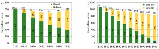 The effect of the addition of n-butanol to diesel (a) and RME biodiesel (b) on the energy dose of fuel delivered in each engine cycle.