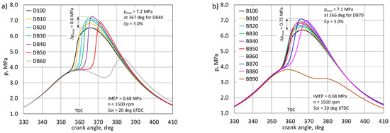 Comparison of the combustion pressure courses for an engine powered by a mixture of diesel fuel with n-butanol (DB) (a) and RME biodiesel with n-butanol (BB) (b).
