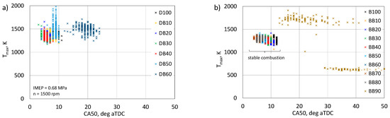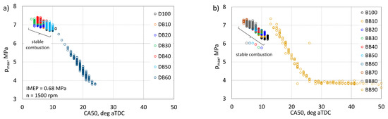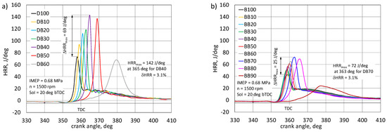 In the engine powered by DB, the highest energy share of n-butanol, at which the engine could still be controlled, was 60%. For the engine powered by BB, the maximum energy share of n-butanol was as much as 80%. Cycles with combustion as well as cycles without combustion occurred with a higher share of n-butanol. The nature of the pressure changes in the engine powered by DB shows the influence of n-butanol content on the delay of self-ignition of the mixture, the effect of which is a significant difference in the rate of heat release, the peak value of which increases with the ignition delay. Burning becomes more violent [4]. For the engine powered by DB, the highest combustion pressure was obtained for a 40% share of n-butanol and reached 7.25 MPa at 7 deg aTDC. On the basis of tests in a constant-volume chamber, it was found that an increase in the share of n-butanol in a mixture with diesel fuel causes an increase in the maximum combustion pressure [16,19,22].