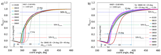 For the same proportion of n-butanol, the maximum HRR value was 142 J/deg and was higher by 69 J/deg in relation to the diesel fuel combustion effect. Combustion in the same engine powered by BB has a different character. Here, up to a 60% share of n-butanol was recorded, practically only an increase in the maximum pressure value, which for the mentioned share was 0.7 MPa and the maximum pressure was close to TDC. Exceeding this share of n-butanol resulted in a visible delay in auto-ignition. This effect is also visible on HRR traces. For the BB-powered engine, the HRR gain was only 25 J/deg. RME, thanks to its properties and good miscibility with n-butanol, gives great possibilities for co-combustion with alcohols, especially with higher alcohols [20,22,38]. In the work [28], a similar effect of butanol share on the nature of heat release rate was observed. The increase in the share of butanol resulted in an increase in the HRRmax value. An important aspect of the assessment of the combustion process in a reciprocating engine is the analysis of its characteristic stages: ignition delay (CA10) and duration of combustion (CA90), as well as the assessment of the crank angle after the TDC for which 50% heat release (CA50) occur. These characteristic combustion stages are determined on the basis of the normalized heat release (Qnorm) [27,45]. The first stage of combustion is the ignition delay, defined as the time (usually expressed in degrees of CA) from the start of injection to the moment when 10% of heat is released. It is assumed that at this stage the flame front is already so developed that it quickly penetrates into the combustion chamber. The ignition delay time is Influenced by many factors, both physical and chemical [22,46]. Consequently, the ignition delay period is often divided into physical and chemical retardation. Both steps usually occur simultaneously. The physical delay is mainly influenced by the injection process, namely the angle of the jet and its range in the combustion chamber, the ability of the jet to atomize, vaporize the fuel, and mix with air within the flammability limits [22]. This feature can be indirectly observed in the course of the heat release rate. In the engine, where this phenomenon occurs intensively, the HRR waveform shows a large share of the kinetic combustion phase. The second stage of the ignition delay is the chemical delay, the duration of which depends on the chemical properties of the fuel [45]. In the case of co-combustion of fuels, with the increasing share of n-butanol, the physicochemical properties of the fuel mixture will change, and this will affect the period of ignition delay, both physically and chemically. Figure 7 shows the normalized heat release curves for the DB and BB powered engine.