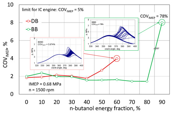 - For both analyzed cases, with up to 40% of the energy content of n-butanol, the COVIMEP index was at the same level of approximately 2%. In the engine powered by a mixture with RME, with up to 80% of the n-butanol content, the COVIMEP index was constant below 2%.