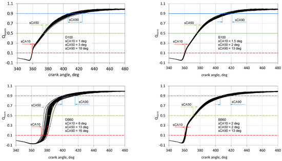 The curves for the analyzed cases were obtained as the average of 200 consecutive engine operation cycles. Characteristic stages of combustion are marked. From the nature of the Qnorm run, it can be seen that the greatest differences for both fuel mixtures will be noticeable for the initial combustion phase. Basic fuels, i.e., diesel fuel and RME biodiesel, differ, inter alia, in the cetane number and thus in their ability to self-ignite [19].
