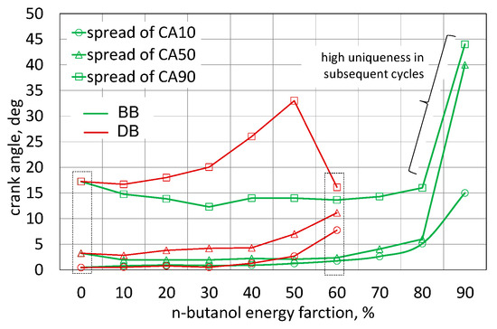 - The spread of the conventional CA90 combustion end in an engine powered by DB increased with an increase in the share of n-butanol to 50%. In an engine powered by BB with up to 80% of the share of n-butanol, the repeatability of CA90 was higher than for the reference fuel.