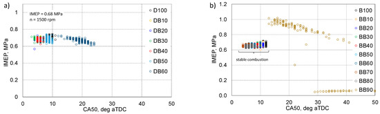 - For the engine fueled with DB mixture up to 50% of n-butanol share, there was a high repeatability of the CA10 combustion start and CA50 angle, whereas in the BB-powered engine up to 70% of n-butanol was achieved.
