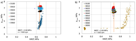 Figure 8 presents the obtained results of the IMEP uniqueness assessment for the engine powered by DB and BB. For both variants, a set of pressure cycles was also shown, respectively. For the highest obtained COVIMEP values for DB, the maximum COVIMEP value was 4% and for BB as much as 78%.