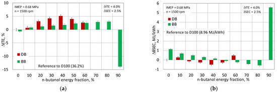 Figure 4a,b show graphically the list of energy doses of fuels. These fuel doses in the engine at the same injection start angle ensured the same load. For the engine powered by a mixture of diesel fuel and n-butanol, for the entire range of fuel share, the energy dose was lower than that required for the engine powered by the reference fuel, i.e., diesel fuel. The lowest energy dose was recorded for the engine powered with 40% of n-butanol energy and it was 907 J/cycle. For a larger share of n-butanol, the requirements for the energy dose increased, which was caused by the deterioration of the combustion process and the increasing uniqueness of cycles.