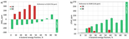THC is a product of the incomplete combustion of hydrocarbon fuel. There are many reasons for excessive THC emissions from a compression ignition engine. The heterogeneity of the air-fuel mixture, its excessive thickening (or excessive dilution) and low temperature cause an increase in THC emissions [42]. Incomplete fuel evaporation, accumulation of fuel in the crevices of the combustion chamber and deposition of the fuel layer on the walls of the chamber due to excessive and misdirected injection are also mentioned as important factors contributing to the formation of THC [32]. In addition, the fuel properties, such as cetane number, heat of vaporization, viscosity, and fuel composition (C/H2 and C/O2 ratio), also have an impact on the total THC emissions. Fuels with a lower cetane number favor the formation of hydrocarbon pollutants [26]. Under conditions of lower engine load, the emission of THC is higher than at full load because combustion takes place at a lower temperature, which is accompanied by a low temperature of the cylinder walls [29,53]. At high load, the rate of heat release is high and intense. Hence, the temperature in the cylinder is high and the emission of THC is low [51]. Figure 18b shows the THC emissions of the engine powered by mixtures of diesel fuel with n-butanol and mixtures of RME biodiesel with n-butanol related to the emissions of diesel fuel (D100) as the reference fuel (116 ppm). Comparing the emissions for diesel fuel alone and for biodiesel, a similar tendency of both fuels to create unburned hydrocarbons can be seen. Only after adding n-butanol, significant differences in the emission of this compound were recorded. The THC emitted from the combustion of biodiesel blends has a higher concentration in the exhaust gas than the THC from the combustion of diesel blends. In the available literature, one can often find studies indicating a different effect of biodiesel co-combusted with alcohols on the emissions of unburned hydrocarbons [26,32,54]. In the presented research, a slight increase in the proportion of alcohol in a mixture with diesel fuel, up to 20%, resulted in an increase in THC emissions compared to diesel fuel, by 56 ppm (48%). Further increasing the amount of n-butanol resulted in the reduction of hydrocarbon emissions to the values obtained for diesel fuel alone. Another increase in THC emissions was achieved for the highest share of n-butanol (DB60). The increase in the share of alcohol in the mixture with biodiesel, up to 60%, resulted in an increase in THC emissions, compared to diesel fuel, by 128 ppm (110%). Further increasing the amount of n-butanol, up to 70%, resulted in a reduction of hydrocarbon emissions, up to 88 ppm over diesel emissions. For BB80 and BB90, another increase in the concentration of hydrocarbons was observed, up to nine times (up to 1092 ppm in relation to D100). The higher THC emissions obtained for the RME biodiesel/n-butanol mixtures compared to the diesel/n-butanol mixtures were mainly due to the lower temperature in the cylinder during combustion, represented by lower maximum values of the heat release rate (HRRmax) (Figure 6). The initial increase in the share of n-butanol in mixtures of diesel fuel/n-butanol and biodiesel RME/n-butanol, increasing the ignition delay, extended the time of formation of the premixed mixture and increased the temperature in the engine cylinder, which should reduce the THC concentration in the exhaust gas [56]. However, under these conditions, other factors that caused the increase in THC emissions were of greater importance. These were slower evaporation of alcohol-containing mixtures, and thus slower and worse mixing of fuel with air due to the high latent heat of vaporization of n-butanol, as well as increased aerosol penetration of the fuel mixture (due to lower viscosity and lower density of n-butanol) causing an undesirable impact of the fuel against the walls of the chamber (and thus extinguishing the flame) [48,51]. The high heat of vaporization of n-butanol increased the probability of deposition of unburned charge on the walls and inside the crevices of the combustion chamber, contributing to an increase in THC emissions [42]. Although the content of molecular oxygen in mixtures with n-butanol was higher than in diesel fuel or biodiesel, its effect on the reduction of THC impurities was negligible [26]. The decrease in THC emission during the further increase in the share of n-butanol, above 20% for DB and 60% for BB, resulted from the dominant influence of the temperature increase in the cylinder caused by the combustion of a homogeneous mixture in the presence of active chemical oxygen. In addition, the additional oxygen improved combustion by diluting the mixture and eliminating fuel-rich zones in the engine cylinder. The re-increase in THC emissions for DB60 and BB90 was caused by a decrease in temperature and heat release rate in the engine cylinder due to too much delay in ignition and shift of combustion to the expansion stroke. Under these conditions, an intense process of extinguishing the flame in the combustion chamber took place, which led to an increase in HC emissions [26,57]. Moreover, the excess of oxygen in mixtures with such a high alcohol content led to excessive depletion of the combustible mixture and incomplete combustion [53].