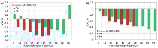 - Summing up the CO emission, it can be said that the share of n-butanol has a positive effect on the emission of CO, and the CO2 emission for the entire range of n-butanol share was lower than for the reference fuel.