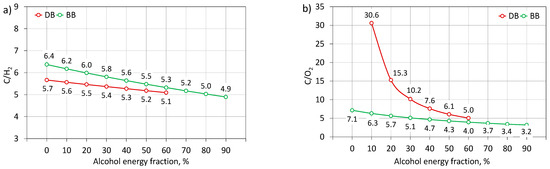 Carbon dioxide (CO2) is the end product of combustion of any fuel that contains a carbon molecule in its atomic structure. In a compression-ignition engine, carbon dioxide is formed as a result of the complete combustion of fuel under high temperature and excess oxygen conditions. The availability of sufficient oxygen for complete combustion increases carbon dioxide emissions. With adequate oxygen availability, the hydroxyl radical OH (one of the main oxidants) converts CO into CO2 [53]. Figure 19b shows the CO2 emissions of the engine fueled with mixtures of diesel fuel and n-butanol as well as mixtures of RME biodiesel and n-butanol related to the emissions of diesel fuel alone (D100) as the reference fuel (7.46%). It can be seen that the addition and increase of n-butanol in the mixture of DB and BB reduced the concentration of carbon dioxide in the exhaust gas of a dual-fuel engine. The engine powered by the diesel/n-butanol mixture was characterized by a greater reduction in emissions. The lowest concentrations were recorded for DB60 and BB90 and they were respectively 1.14% (15%) and 1.43% (19%) below the concentration value obtained for the reference fuel. The decrease in CO2 emissions resulted mainly from the decrease in the amount of carbon supplied to the cylinder in mixtures with alcohol fuel, mapped by a decrease in the C/H2 ratio (Figure 20a). This factor turned out to have a greater effect on reducing the concentration of carbon dioxide in the exhaust gas than the additional amount of oxygen supplied in n-butanol (C/O2 in Figure 20b).