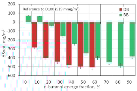 - The share of n-butanol has a positive effect on the reduction of soot emissions. Only for B100 and BB10 was the emission of soot higher by approximately 70 mg/m3 compared to the diesel fuel supply. The greatest soot reduction was recorded for the DB60 fuel by over 500 mg/m3.