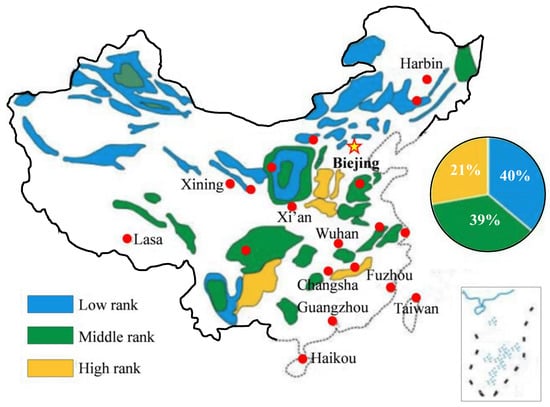 CBM resource distribution in China with a depth less than 2000 m. The vitrinite reflectance of a low-rank CBM reservoir is Ro ≤ 0.7%, and those of middle-rank and high-rank reservoirs are 0.7% < Ro < 1.9%, Ro ≥ 1.9%, respectively (modified from Li et al., 2018) [].