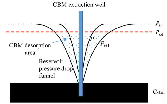 CBM mainly exists in the form of adsorbed gas in coal reservoirs. During the CBM exploitation, methane can be desorbed and penetrates towards the wellbore only when the reservoir pressure sufficiently depletes below the critical desorption pressure [,]. The traditional approaches and developed models for in-place natural gas resource and reserve estimation calculations suitable for reservoir rocks displaying a wide range of permeability and porosity distributions are described by Radwan et al. (2022) []. The reservoir pressure is one of the most important parameters that affect CBM exploitation, and directly controls the content and saturation of adsorbed gas in coal reservoirs. The reservoir pressure may change dynamically as CBM is extracted. A pressure drop funnel will be formed around the drainage well to rapidly reduce the reservoir pressure []. With the progress of CBM exploitation, the reservoir pressure decreases continuously from the near field to the far, and the range of the pressure drop funnel continues to expand [,]. When the reservoir pressure after drainage is reduced to the critical desorption pressure, the methane adsorbed in the coal seam is gradually desorbed and penetrates to hydraulic fractures and wellbore. With the expansion of the range of the pressure drop funnel, the desorption radius of CBM also becomes larger. The schematic diagram of coal seam pressure drop propagation is shown in Figure 2. Accurate determination of the spatiotemporal dynamic evolution of reservoir pressure is the key to effectively assessing desorption intensity, cross-well interference, and gas production [,]. Clarkson et al. (2007 [], 2009 []) investigated the reservoir pressure evolution in a CBM reservoir in Canada and concluded that the average reservoir pressure could be obtained from the material balance equation. Based on Chen et al. (2015) [], the reservoir pressure could directly affect coal intrinsic permeability, thus determining the output of CBM. Li et al. (2016) [] investigated the influence of fracture distribution on reservoir pressure depletion, and summarized the depressurization transferring modes. In addition, they proposed a theoretical model to calculate the reservoir depressurization for bounded drainage. In short, numerous researchers have investigated the evolution of reservoir pressure in CBM extraction. Among them, few studies have considered the influence of hydraulic fracture morphology and distribution.