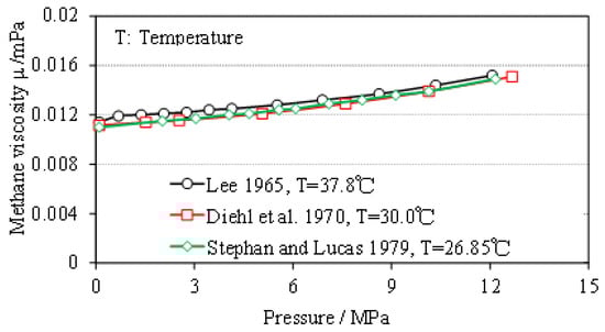 The methane viscosity, μ, under different pressures and temperatures has been tested by numerous researchers. Figure 3 shows the methane viscosity testing results by Lee (1965) [], Diehl et al. (1970) [], and Stephan and Lucas (1979) [], respectively. When the pressure rises from 0 MPa to 12 MPa, the methane viscosity, μ, changes within the small region of 0.011~0.015 mPa. The methane viscosity is not sensitive to changes in pressure when the pressure is low. Therefore, in this paper, to simplify the calculation, the methane viscosity, μ, is assumed to be a constant value, which does not change with the pressure.