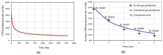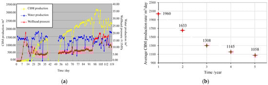 CBM production rate within 5 years. (a) CBM production rate at different production times and (b) the average CBM production rate after exploited different years.