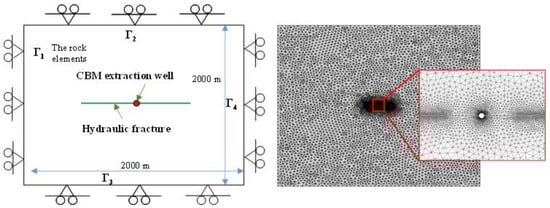 A finite element numerical model of the CBM reservoir was established by means of COMSOL Multiphysics software. The calculation of reservoir pressure in the process of gas production is reduced to the problem of solving partial differential equations. The size of the simulated reservoir area is 2000 × 2000 m, and the schematic diagram of the model is shown in Figure 5. To obtain more accurate simulation results, the grid size is extremely small. The grid refinement is carried out near the production well.