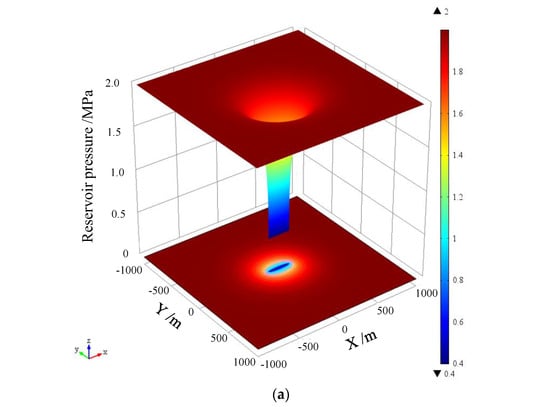 - The reservoir pressure is distributed symmetrically in an elliptical shape, with the hydraulic fracture direction as the long axis. The phenomenon of “reservoir pressure singularity” exists near the fracture tip, which means that the reservoir pressure decreases very rapidly in a small region near the fracture tip. The existence of a hydraulic fracture greatly reduces the reservoir pressure in the process of CBM exploitation, significantly increases the influence range of single-well extraction, and greatly rises the permeability of coal seams.