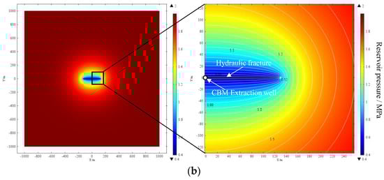 Reservoir pressure distribution after mining for 5 years when a hydraulic fracture half-length is 130 m: (a) three-dimensional perspective, (b) two-dimensional perspective.