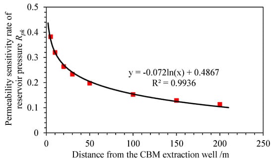 According to Equation (17), we calculated the permeability sensitivity coefficient of reservoir pressure, Rpk, at different distances from the CBM well, and the calculation results are shown in Figure 10. The permeability sensitivity coefficient of reservoir pressure, Rpk, decreases logarithmically as the distance from the CBM extraction well increases. This indicates that the influence range of the pressure drop funnel in the CBM extraction process is limited, and CBM adsorbed in the coal seam far away from the extraction well is difficult to be extracted. The permeability sensitivity coefficient of the reservoir pressure, Rpk, could contribute to optimizing the spacing of the CBM group wells.