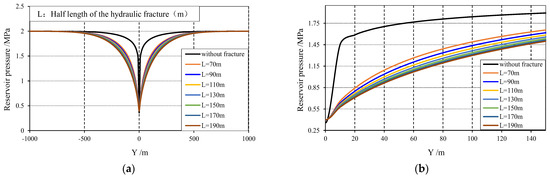 The reservoir pressure for different hydraulic fracture morphologies is calculated, and those on profile line 1 (see Figure 7) after 5 years are shown in Figure 11, and those on profile line 2 are shown in Figure 12. The reservoir pressure drop of CBM exploitation with hydraulic fractures is much higher than that without hydraulic fractures, indicating that the effect of hydraulic fracturing is significant. With the increase in the hydraulic fracture length, the reservoir pressure drops after the CBM being extracted for the same time increases. The pressure drop difference along the fracture length is more significant than that perpendicular to the fracture.