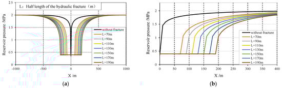 The reservoir pressure when different fracture lengths of each point on the profile line 1 after mining for 5 years. (a) the whole profile line, and (b) a part of profile line 1.