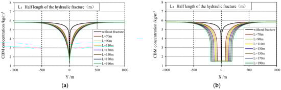 CBM concentration when different fracture lengths on the profile lines after 5 years of extraction. (a) profile line 1 and (b) profile line 2.