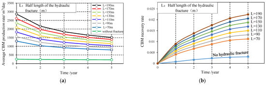 The CBM concentrations for different hydraulic fracture lengths are also calculated, and those on profile lines 1 and 2 (see Figure 5) after 5 years of extraction are shown in Figure 13. When there is a hydraulic fracture, the CBM extraction volume is much larger than that without a hydraulic fracture. Figure 14 shows the average CBM production rate and CBM recovery rate of the reservoir with different fracture morphologies. With the increase in fracture length, the gas production rate at the same time gradually increases; the average daily gas production at the same time of extraction also increases gradually. Calculated over a five-year period, the average daily gas production of fractures with a half-length of 70–190 m is 792.9–1514.1 m3/day. Calculated based on the reservoir area of 4.0 km2, the recovery rate of single well extraction is shown in Figure 14b. The CBM recovery rate is basically proportional to the fracture length. However, the recovery curve flattens out as the extraction progresses. The maximum recovery rate for a single well without a hydraulic fracture is just 0.0031, while for a hydraulic fracture half-length of 130 m, the recovery rate could reach 0.0169 after 5 years. However, due to the limitations of the physical and mechanical properties of the reservoir itself, construction equipment, and methods, the hydraulic fractures could not grow indefinitely. Considering the construction cost, there must be an optimal hydraulic fracture shape and gas production, which is not the focus of this paper.