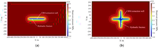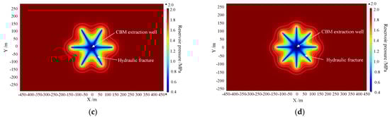 As shown in Figure 15, a CBM extraction numerical model with different hydraulic fracture morphologies is established, and the half-length of a single hydraulic fracture is 130 m. The reservoir pressure distribution after one month is calculated when one, two, three, and four hydraulic fractures exist, respectively. The superposition effect of reservoir pressure among multiple hydraulic fractures can be clearly seen. When multiple hydraulic fractures exist, CBM near fracture intersections can be fully desorbed, and the influence range of the pressure drop funnel formed in the CBM extraction process is also significant.