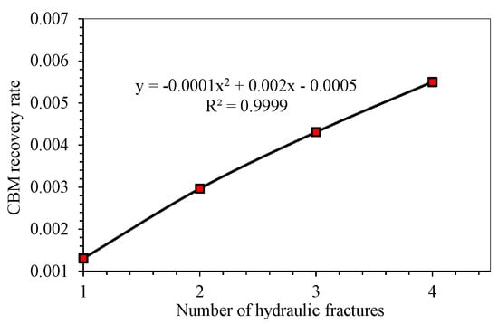 The CBM recovery rate results of the reservoir with different hydraulic fracture morphologies are shown in Figure 16. As the number of hydraulic fractures increases, CBM recovery rate increases in a quadratic function. This indicates that the formation of hydraulic fracture networks could greatly improve reservoir permeability, and CBM within the affected area of hydraulic fractures could be extracted in a short time. However, the impact of fracturing is limited, and the production of CBM will gradually plateau as the extraction proceeds.