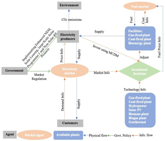 Actors, markets, and environments are the three autonomous and active agents that comprise the model structure. Producers of electricity, the government, and customers are the key actors. The model’s key components are the electric power market and the fuel market, where commerce is enabled, and players engage with each other by acquiring fuels and trading electric power, as shown in Figure 1. Agent actions are updated yearly based on the design. Therefore, the simulation time step or unit is a year.