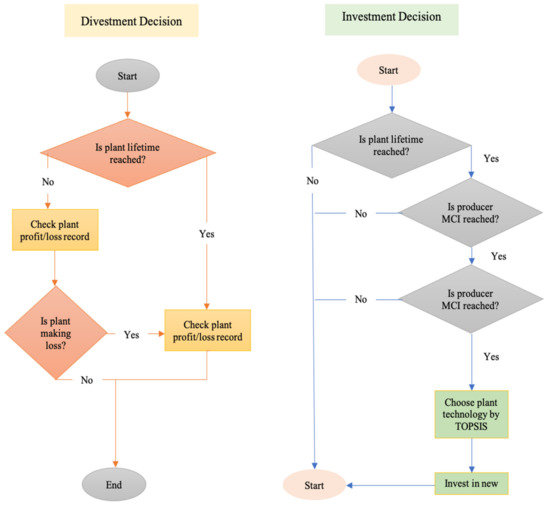 Meanwhile, maximum concurrent investments (MCI) referred to the most simultaneous power plants companies can invest in at once. Every agent could give different weights to DSI and MCI, giving them a different management approach. As a result, these values depended on each agent. Figure 2 displays the computational stages for each producer. The producers choses the preferable technology for the investment once the choice to invest was taken. Because autonomous agents were expected to utilise more than one factor to select the best power plant, the decision on what type of plant will be invested in was based on a multi-criteria decision making (MCDM) methodology [61,62]. To choose its favourite technology, an agent used the technique for order preference by similarity to ideal solution (TOPSIS), the most extensively used and practical MCDM approach (Figure 2).