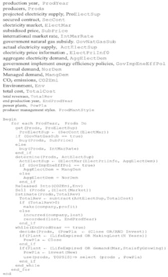 ABM, a dynamic model, was always executed on a computer with the evolution of time calculated as an iterative process—an algorithm—in which autonomous agents were updated following the defined principles. Our model presented some algorithms to ensure smooth energy decarbonisation (Figure 3).