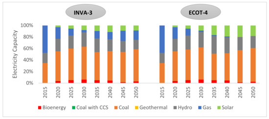 As presented in Figure 4, the generation capacity for the INVA-3 and ECOT-4 scenarios was expected to increase from 25,064 MW in 2015 to a value between 72,425 MW and 73,071 MW by 2050 for the INVA and ECOT scenarios, respectively. In the INVA scenario, the share of gas-fired plants fell from 47% in 2015 to about 16% by 2050, just as coal-fired counterparts increased from 35% in 2015 to 56% by 2050. Electricity fuelled by renewable sources also increased to 12% by 2050. However, generation fuelled by natural gas was retired from the electricity system by 2044, while coal-fired power plants increased from 8696.9 MW (35%) in 2015 to 42,400 MW (59%) by 2050. An imminent increase in capacity was observed in renewable deployment from 0% in 2015 to 2% and 18% for bioenergy and solar PV by 2050 (see Figure 4).