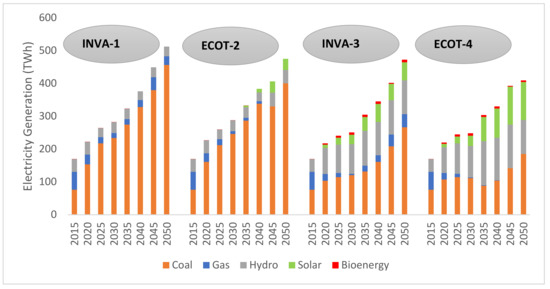 A comparison of electricity generation by fuel type between INVA and ECOT scenarios under renewable energy policies is provided in Figure 5. If we zoom in to 2050 in the INVA scenario, the coal power plant is the dominant power generator at 79%, followed by solar PV at 10% and hydro at 10%. It is also observed that natural gas, geothermal, and bioenergy plants are not part of the generation mix by the end of the simulation period. In the ECOT scenario, similar energy mix profiles as per INVA are observed; however, a noteworthy observation is an increase in electricity generation from 285.82 TWh to 472.79 TWh by 2050. The second observation is that coal power generation dominance is reduced to 56%. The decline in coal power generation is projected to be compensated for by a combination of hydro, solar PV, bioenergy, and natural gas at 22%, 12%, 2%, and 8% by 2050, respectively (see Figure 5).