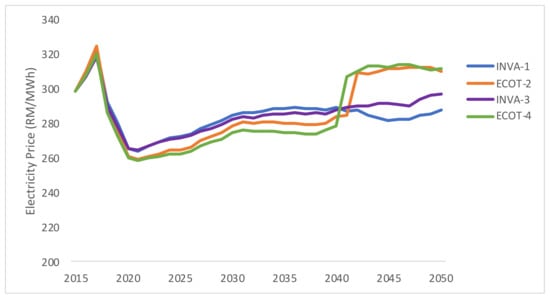 Based on the existing energy market structure, we ran a series of economically and politically significant scenarios to examine the implications of renewable energy policy and its influences on the electrical sector’s transition to low-carbon pathways. Four scenarios were defined to explore the effects of energy policies on Malaysia’s electricity sector in various economic situations until 2050. First, the scenarios varied based on the state of the economy (“Initial-value” and “Economic-trend”). The agents’ virtual environment was designed using scenarios (Table 1). Consequently, a scenario was characterised by well-defined limiting conditions on government regulations and the input data of the energy system.